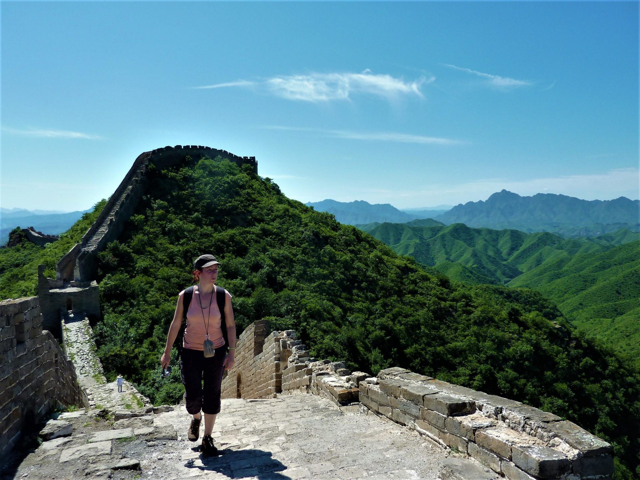 Ale abych kvůli všem domluvám nezapomněla na to hlavní. Totiž na krásu krajiny protnutou zdánlivě tenkou linií zdi. Nikde není ani mráčku a kontrast mezi ostře zelenými kopci a blankytně modrou oblohou je fascinující. Kam oko dohlédne, všude jen zelená a modrá barva. Tisíce let starou stavbu, dříve chránící zemědělské národy před nájezdy nomádských pastevců, máme jako na dlani. Na mnoha místech podlehla času a hradby jsou poničené. Z jejich krásy to ale neubralo ani ždibec. Naopak.