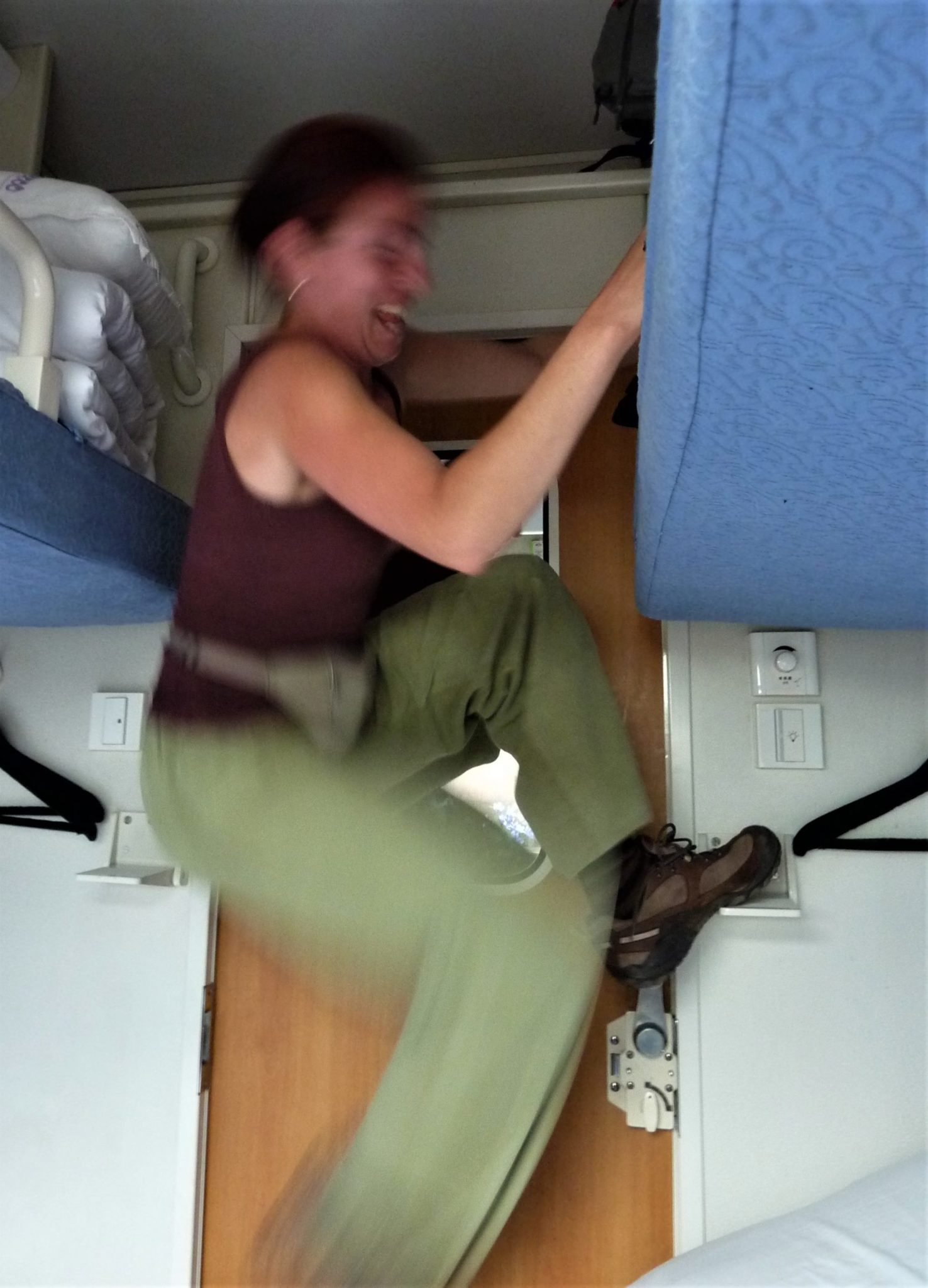„Tha šan čejpu, pchjan šo pačan si,“ tak nějak zní odpověď. Evidentně volí stejnou komunikační strategii jako já. Trochu se začínám obávat, že mi nezbude nic jiného, než počkat, až půjde Číňan z protější vrchní postele čůrat a pak omrknu, jak tam poleze. Jen doufám, že k tomu nebudu muset být mistrem světa na visuté hrazdě či mistrem kung-fu. Číňan, který leží v mezipatře, najednou vyklápí ze zdi dva malé výstupky a ukazuje na ně. Obava, že budu muset šestatřicetihodinovou cestu stát v chodbičce, přestože mám koupené lůžko, se naštěstí nenaplňuje. Vlak se pomalu rozjíždí.