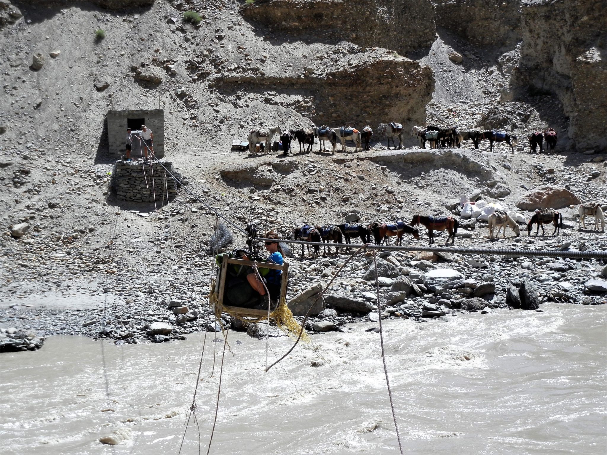 Ráno vznikají drobné neshody kvůli dalšímu rozplánování treku. Nakonec se shodujeme, že rozhodnutí necháme až na dnešní odpoledne a spor se naštěstí nijak nevyostřuje. Než ale budeme pokračovat dál, musíme překročit řeku Zanskar. Jak správně tušíte, most tu zatím nikdo nepostavil. Přes burácející řeku je natažené ocelové lano, na něm zavěšený polorozpadlý dřevěný koš a na každém jeho konci připevněné lano. Na jednom břehu nasedáme po jednom do koše, vzápětí začíná chlapík na druhé straně tahat lano a přitahuje celý náklad k sobě. Po vyexpedovaní obsahu koše přichází na řadu chlapík na našem břehu, který taháním za lano vrací prázdný koš zase zpátky. A tak pořád dokola. V rozhoupaném koši nad zakaleným Zanskarem sleduju důmyslné propojení ocelového lana s košem. Bezpečnostními normami EU by zdejší zařízení zřejmě neprošlo. Ale co, hlavně, že to funguje. Pony men s oslíky se s námi rozloučil už v kempu a za řeknou na nás čeká další parta oslů a novým pony men.