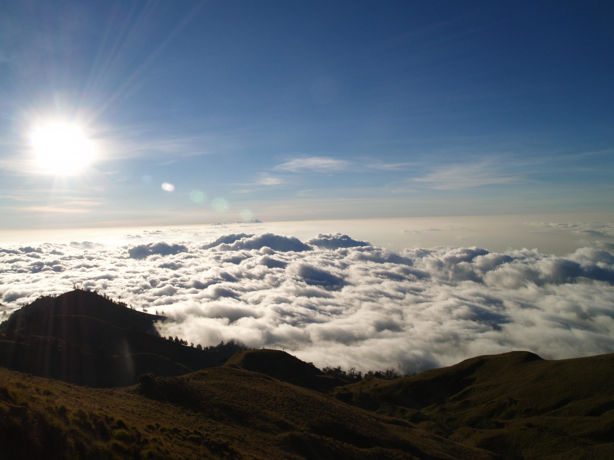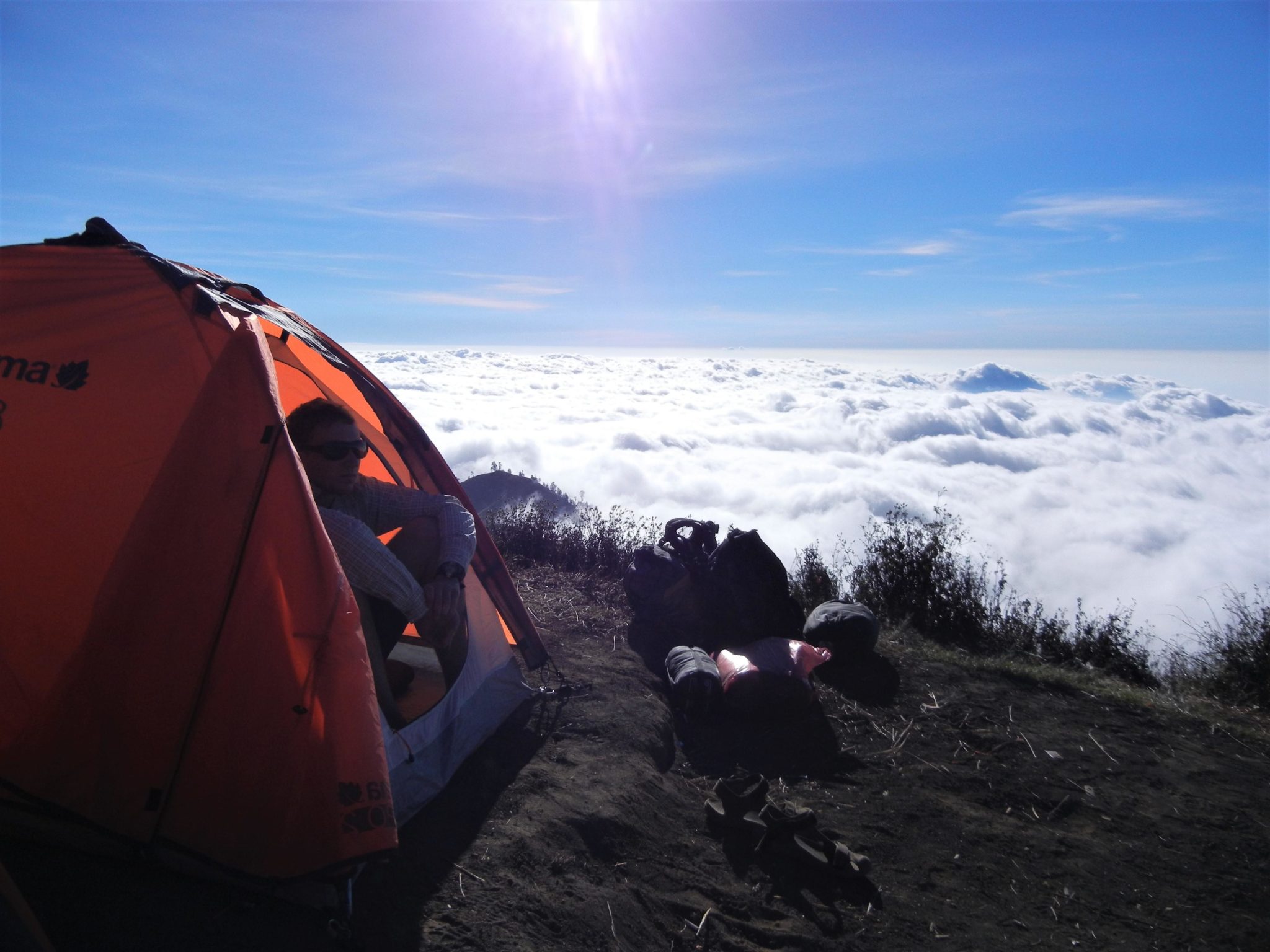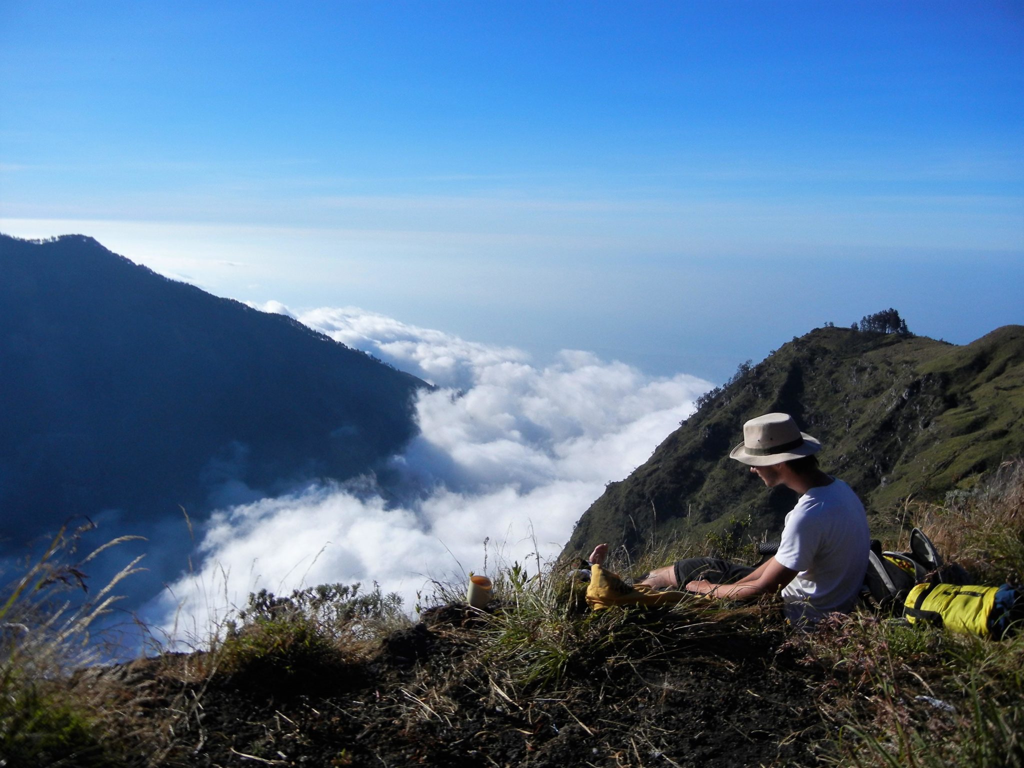 Po obědě je cestička stále strmější a strmější. Kolem druhé hodiny odpoledne se dostáváme do výšky, kde končí les a otvírá se občasný výhled do údolíček, které vytvořila před mnoha lety valící se láva. Místo neprostupného pralesa teď kazí výhled jen občasné mraky povalující se kolem nás. Hovory mezi trekaři ustávají a nahrazuje je nepřetržité funění. Nohy začínají těžknout, když se snažím překračovat vystouplé kořeny nebo kameny bránící v cestě. Zatoužím po alespoň několika metrech rovné cesty, aby si stehna a lýtka trochu odpočinula. Marně. Cesta je stále příkřejší. Už si nepovídáme ani během krátkých pauziček, které nám průvodce čas od času dopřeje. Pot ze mě lije a už se nemůžu dočkat, až se došplhám na okraj kráteru ve výšce zhruba 2 800m n. m., kde máme dnes tábořit. Závěr výstupu je sice opravdu náročný, ale stále mě ještě nepřesvědčuje o tom, že dostat se na vrchol bude „very, very hard“. Pot a bolavé nohy zkrátka k chození po horách patří! Navíc nás za vynaloženou námahu čeká odměna doslova královská. Otevírá se před námi kráter s blankytně modrou hladinou jezera Danau Segara Anak. Uprostřed vodní plochy se tyčí kužel, který teprve před několika stovkami let vytvořila erupce sopky Gunung Barujari (2 351m n. m.). Vědomí o jejím posledním výbuchu v květnu roku 2010 způsobuje lehké mrazení. Na celou tu nádheru dohlíží z druhého břehu jezera samotný hrdý vulkán Gunung Rinjani, který konečně vidíme v celé jeho hrozivé kráse. Dech beroucí pohled se ještě umocňuje v momentě, kdy se ohlédnu a za sebou vidím nekonečné jezero mraků, do kterého se začínají opírat paprsky právě začínajícího západu slunce. Že je to kýč? Ale ten nejkrásnější jaký jsem kdy viděla!