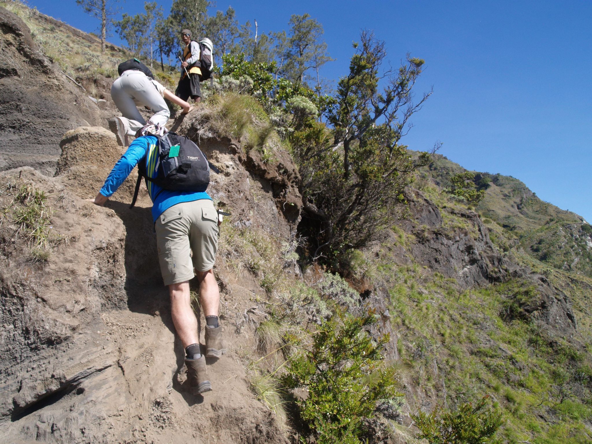 Do Senaru, výchozího bodu pro výstup na Gunung Rinjani, se dostávám poměrně hladce. Ostrovy Gili a sopka jsou totiž hlavními lákadly Lomboku, a tak je spojení zajištěno lodní dopravou a bemem – místní minibus. Většina batůžkářů vyráží z pláží rovnou na vrchol. Ti prozřetelnější to dělají právě naopak. Bohužel, až pozdě jsem zjistila, že odpočinek na sluncem vyhřáté pláži by se po zdolání vrcholu sopky hodil víc, než cokoliv jiného. V Senaru nabízejí snad všechny agentury třídenní trek na vrchol Gunung Rinjani. Jinak než s průvodcem se vulkán, bohužel, zdolat nedá. Do parku je vstup na vlastní pěst zakázaný, a tak se přidávám k mezinárodní osmičlenné skupince s asi desítkou nosičů a brzy ráno vyrážíme směrem k vrcholu. Nejzajímavější člen výpravy je bezesporu zhruba padesátiletý světoběžník neznámého původu. Všude byl, všechno zná, od všeho má klíče… Mluví snad všemi světovými jazyky a vylézt na tuhle sopku bude prý hračka. Docela mě těší, že je tu někdo další, kdo si s výstupem, navzdory všudypřítomným prognózám o náročnosti treku, neláme hlavu. Dalším ukazatelem na přehnané řeči o víc než namáhavém výstupu jsou pro mě žabky, které mají všichni nosiči na nohou – někteří jdou dokonce úplně naboso.