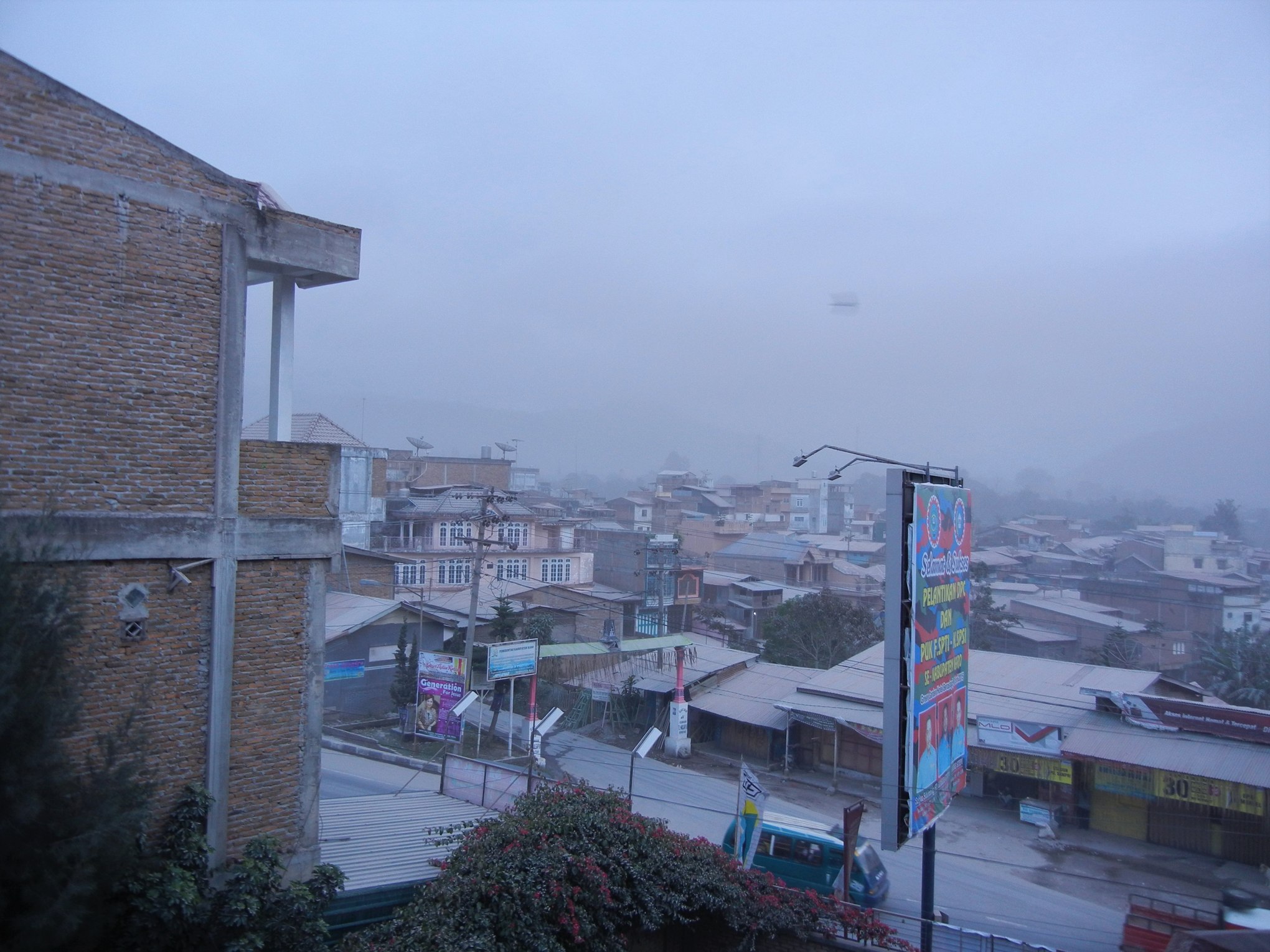 V 16:05 se ubytováváme v hostelu Wisma Sibayak. V 16:20 je zaznamenána exploze Sinabungu! V tu chvíli to ale ještě netušíme. Erupce není tak silná, aby ve zhruba 15km vzdáleném Berastagi otřásla zemí, a tak na pokoji v klidu přebíráme zatuchlé věci a chystáme se je odnést do prádelny. Když v 16:45 vylézáme, nic netušíc, z pokoje, nestačíme se divit. Původně rušná ulice je liduprázdná, vidět je jen na pár metrů a z nebe prší popel. Fakt. Nikdy jsem nic podobnýho neviděla. Na trička a do vlasů nám dopadají drobné kapky sopečného prachu. Mám pocit, jako bych se ocitla na jiné planetě. V Berastagi by se v tu chvíli klidně mohl točit katastrofický film bez použití jakýchkoliv triků a efektů. Začínají nás štípat oči a těžko se nám dýchá. Rychle se proto vracíme do hostelu a teprve tady se od recepční dozvídáme, co se stalo. Říká to skoro znuděně a podává nám roušky přes pusu, které máme při pobytu venku nosit. Šlo prý jen o menší výbuch, který nikoho na životech neohrožuje, ale dýchat sopečný popel není zdravé. Jestli nikam nutně nemusíme vycházet, máme zůstat raději na pokoji.