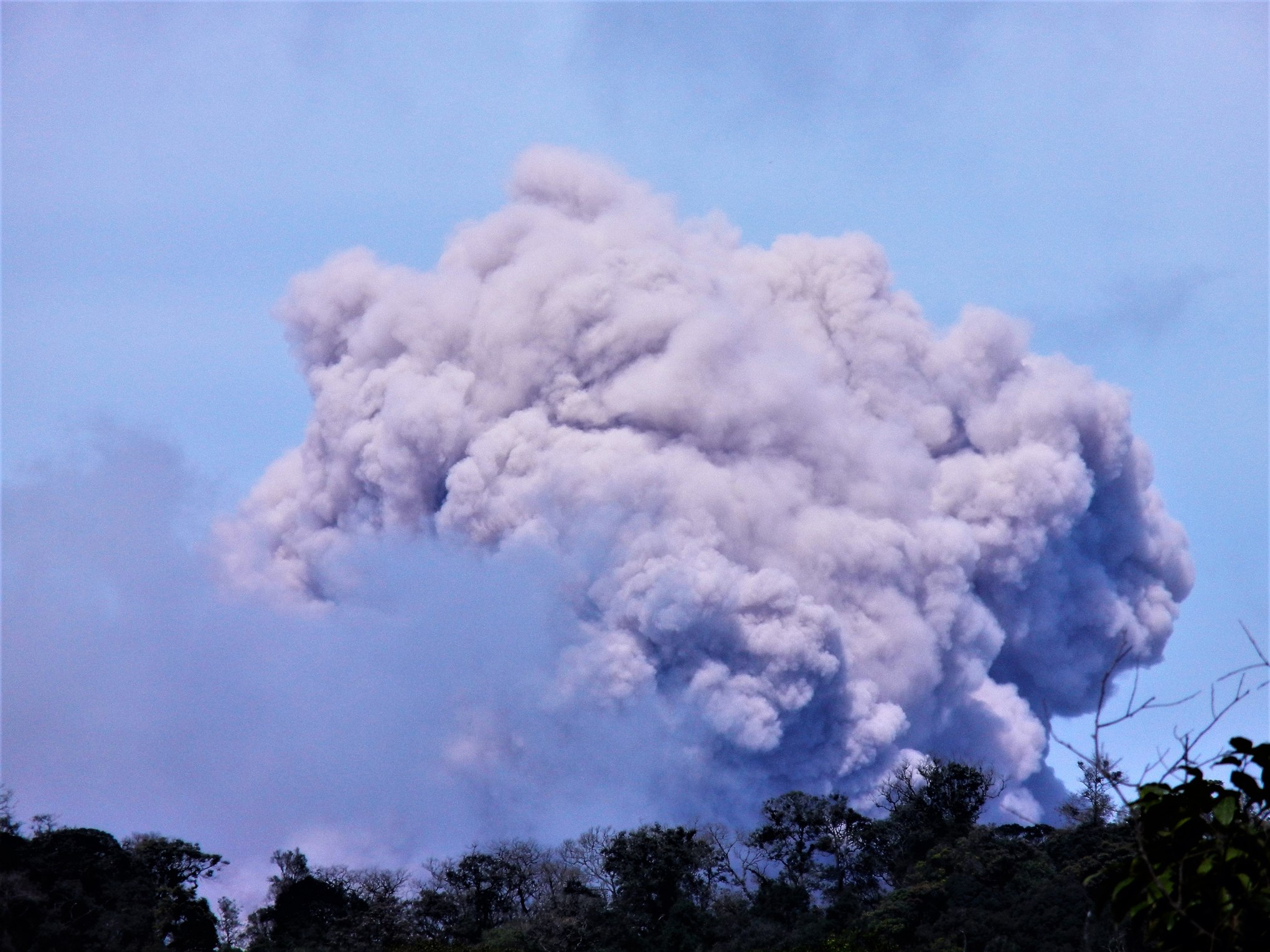 Když se asi po hodině cesty vzhůru otočím, abych se pokochala výhledem do kraje, vidím obrovský hřib sopečného popela stoupající k nebi. Sinabung znovu vybuchl! Trochu zpanikaříme a chceme se vrátit dolů do kanceláře. Co když vítr zanese sopečný popel naším směrem a ocitneme se uprostřed něho? Budeme v něm moct dýchat? Ukrýt se není kam, a tak vzrušeně debatujeme o návratu. Nechceme se ale vzdát předčasně. Koneckonců sloup prachu sledujeme z dostatečné vzdálenosti, a tak se usazujeme na sluncem vyhřátý asfalt a čekáme, kterým směrem vítr šedý mrak požene. Vypadá to dobře. Masa sopečného popela se stáčí na Berastagi a nám se trochu ulevuje. Rozhodujeme se pokračovat dál.