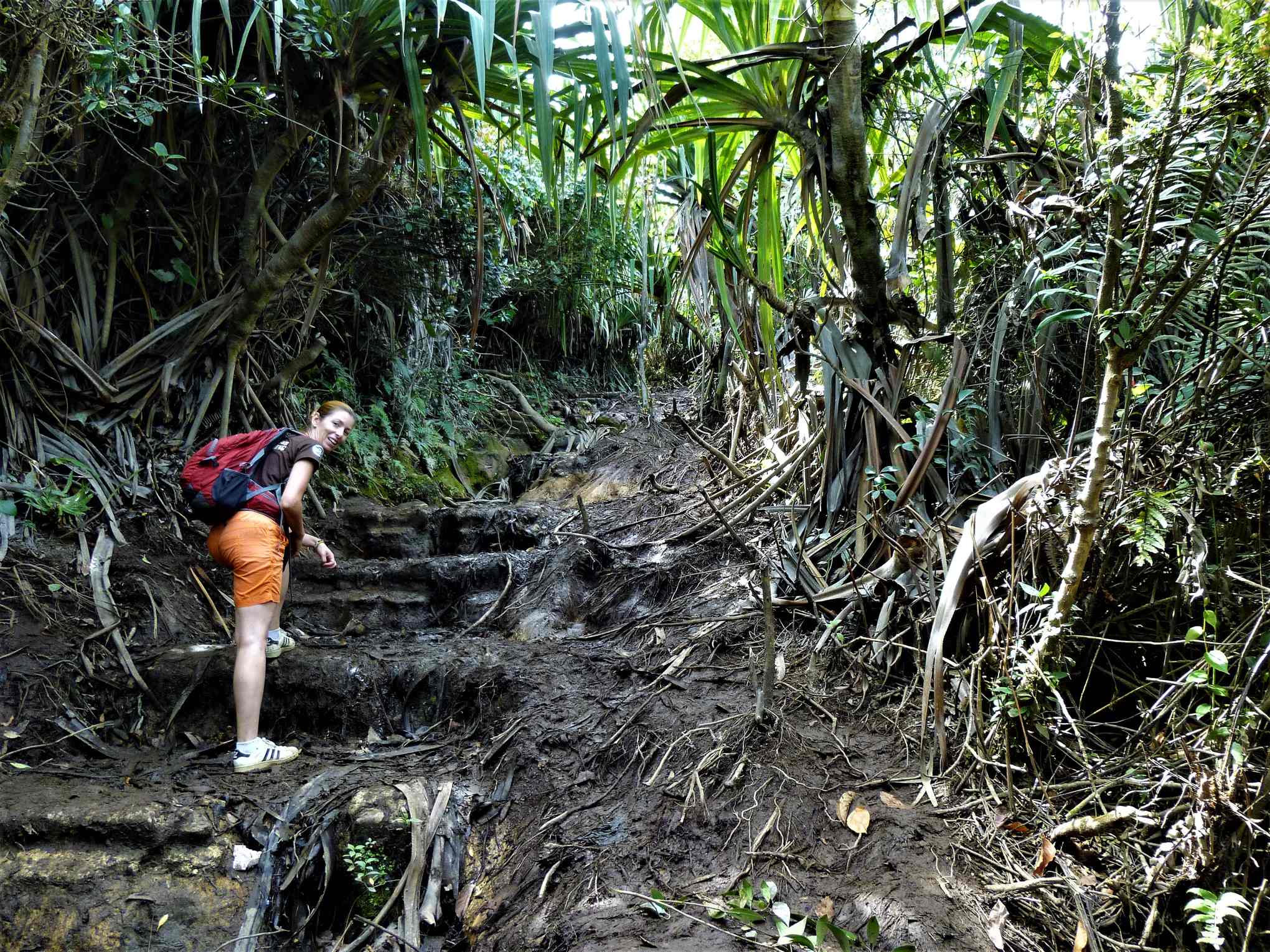 V okolí kráteru trávíme nakonec skoro celou hodinu. Znovu fotíme, svačíme a kocháme se pohledem do kraje. Abych měla výhled ještě o něco lepší šplhám na nejvyšší bod sopky. Léňa zůstává dole, protože pro zdolání posledních desítek metrů se musí chvílemi trochu popolézat po menší skalce (opravdu jen trochu, lezecká obtížnost cca 2). Přesto chápu, že se jí do toho nechce a obrovské hrubé kameny přelézám sama. Výhled do kráteru, který vypouští tenké sloupy bílého kouře, bere dech. Sedím nahoře a vychutnávám si klid narušovaný jen syčením sopečných plynů, které si z nitra země derou cestu na povrch. Doufám jen, že obrovská síla, která dřímá někde hluboko pode mnou, nebude chtít zrovna v téhle chvíli předvést své pekelné divadlo. Zvláštní atmosféra strachu z nezkrotné a nevyzpytatelné přírody je cítit všude kolem. Nedivím se, že mnohé národy považují sopky za sídla bohů. Už římský protějšek řeckého boha ohně Héfaista se nazýval Vulcanus. Samotní bohové tedy nejspíš mohou za to, že sopkám už po staletí říkáme vulkány.