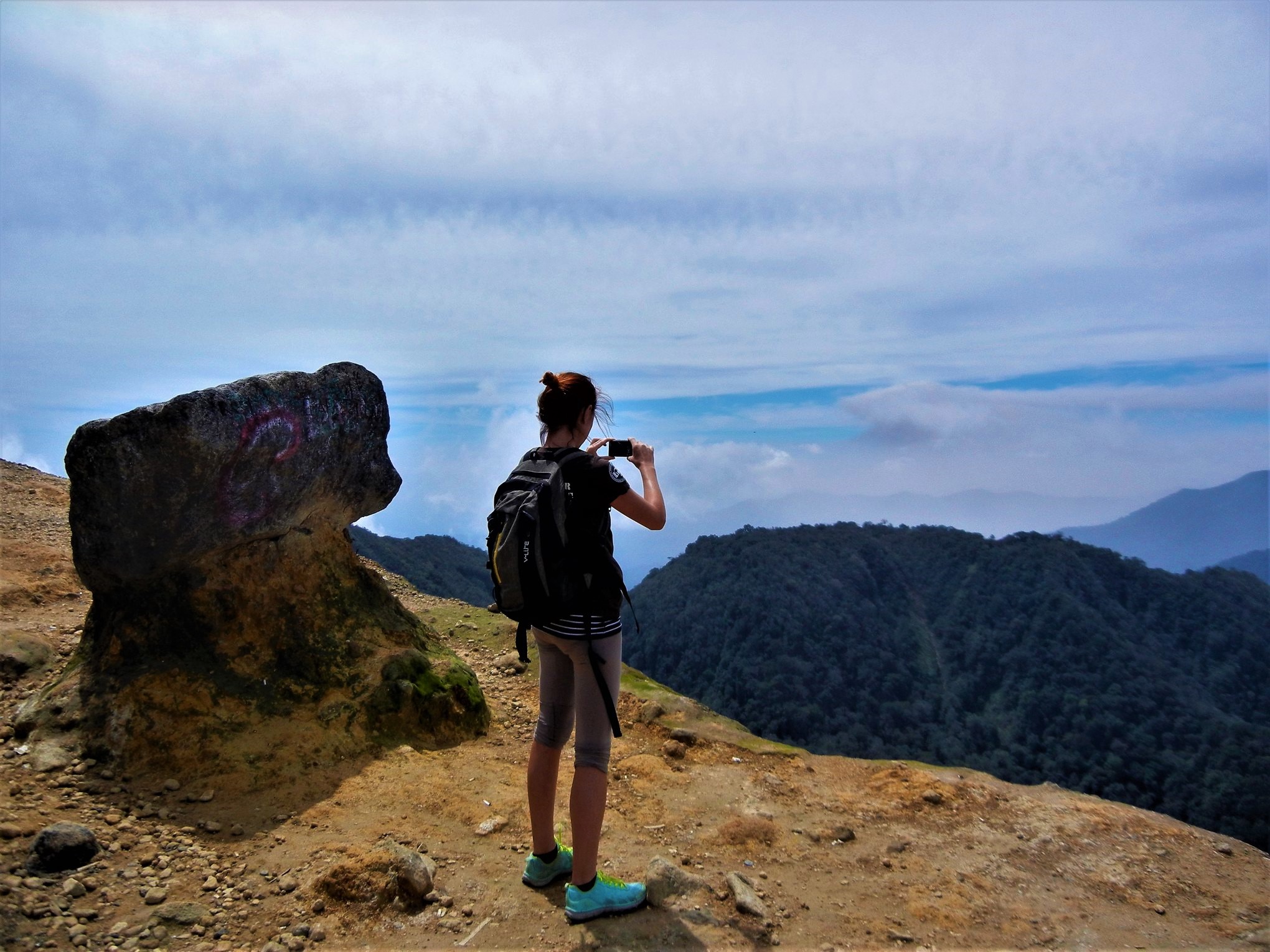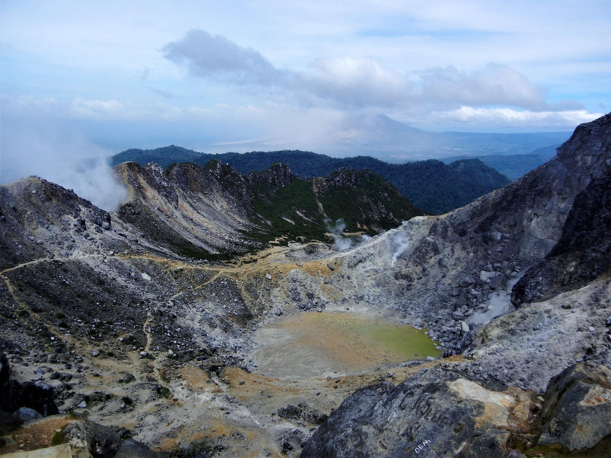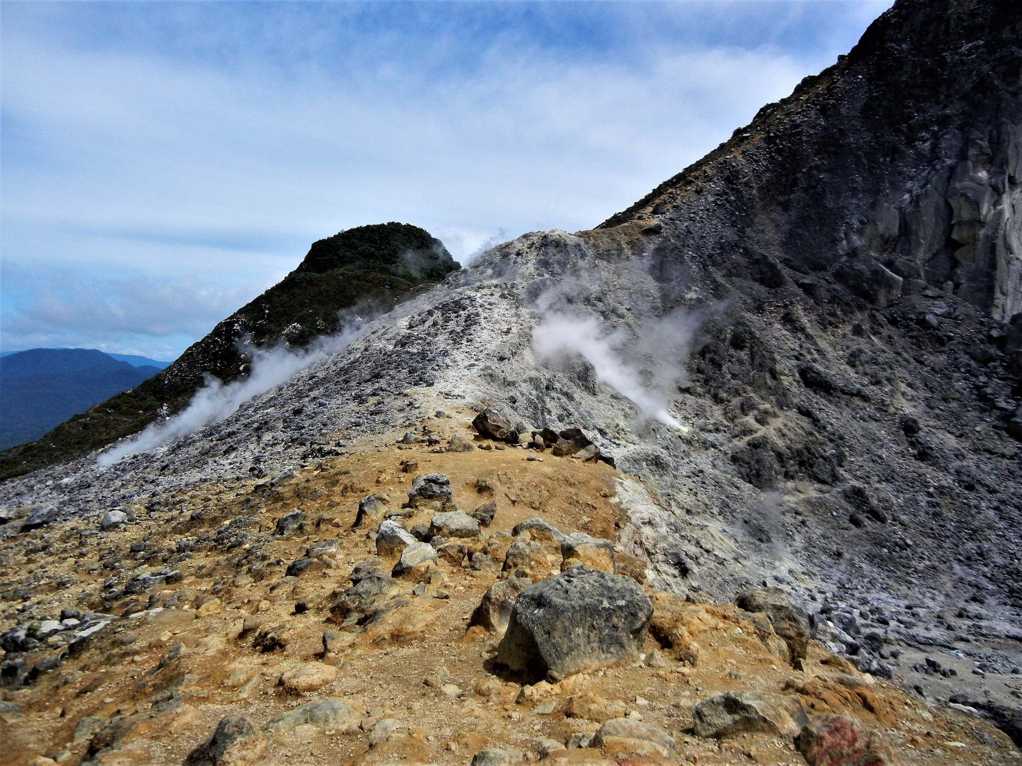Trasa na vrchol sopky, během které jsme nepotkaly ani živáčka, je dlouhá zhruba 7km. Cestou jsme fotily, svačily a trochu se i bály. Když už to vypadalo, že jsme naše obavy nechaly přilepené na černém asfaltu, přicházejí nové, mnohem silnější. Otevírá se nám pohled na trochu netypický vrchol sopky. Kráter vulkánu je z jedné strany rozpadlý, a tak před sebou zřetelně vidíme otevřené průduchy (odborníci by měli k tomuto termínu zřejmě výhrady), které chrlí sopečné plyny. V nose mě najednou štípe nepříjemný zápach připomínající zkažená vejce a v duchu se ptám, jestli je to normální stav a nebo Sibayak začíná taky soptit? Už jsem v životě na pár sopek vylezla, ale všechny byly vyhaslé (nebo zrovna jen spící) a vulkány připomínaly jen tvarem, nikoliv činností. Kromě strachu mě ale pohlcuje ještě další silný pocit, a sice zvědavost.