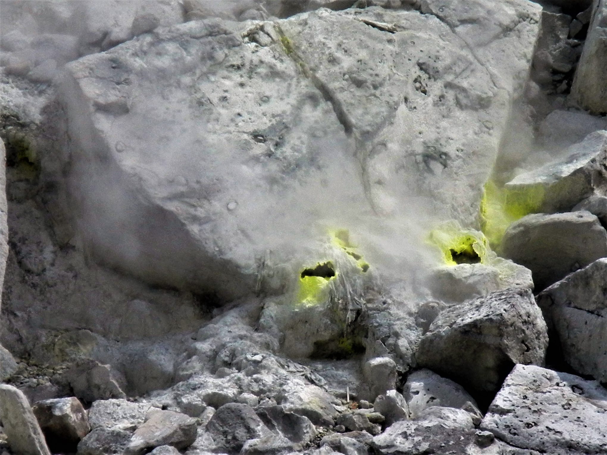 Kráter působí až nadpozemským dojmem a vůně síry dodává přírodnímu divadlu pekelnou atmosféru. Znovu si připadám jako v nějakém sci-fi filmu (od včerejška už podruhé, to se mi nestává často). Kdyby se před námi znenadání neobjevil pár italských turistů s místním průvodcem, asi bychom si udělaly pár fotek a rychle mazaly dolů. Průvodce nám ale vysvětluje, že chrlení síry je normální a není se vůbec čeho bát. Úřady to prý mají pod kontrolou. Netuším nakolik se dá spoléhat na místní úřady, ale na vrcholu se mi tak líbí, že průvodci věřím, a tak jdeme prozkoumat zdejší terén. Trocha nervozity z toho, že vedlejší kopec před necelou hodinou vybuchl, dává naší prohlídce rozměr dobrodružné expedice.