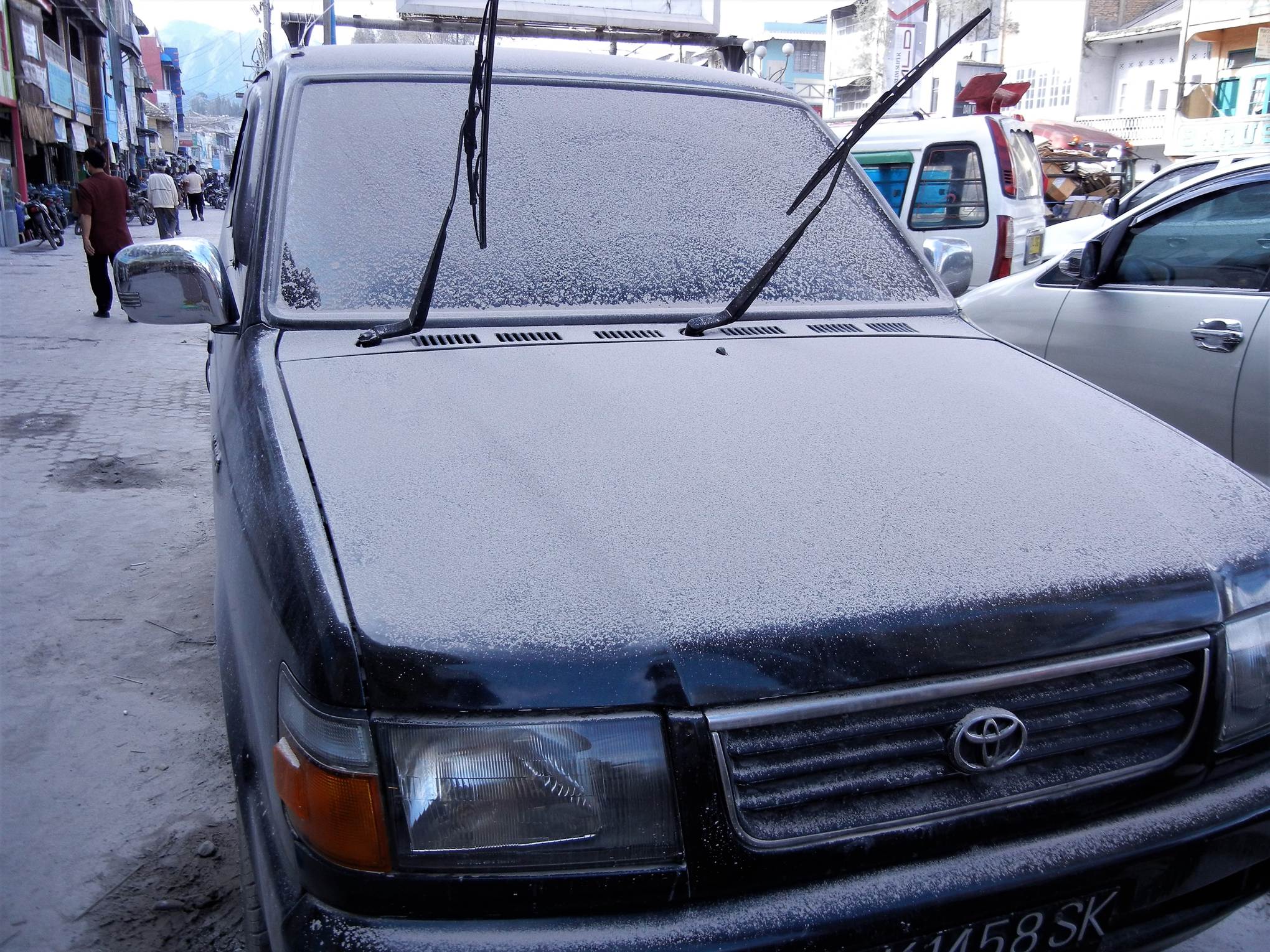 Sinabung znovu vybuchl zrovna když jsme večeřely a pokryl město další vrstvou popela. Až po návratu domů jsem se ze zpráv dozvěděla, že během explozí v tomto období zahynulo 14 lidí.