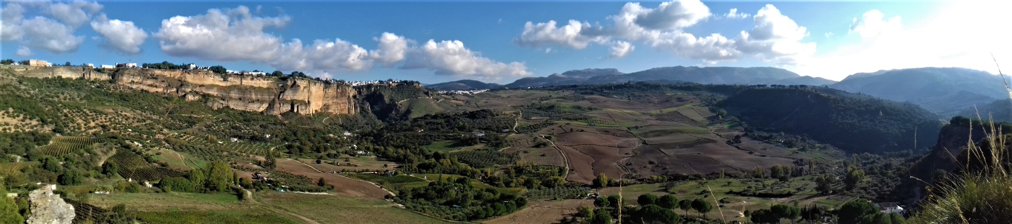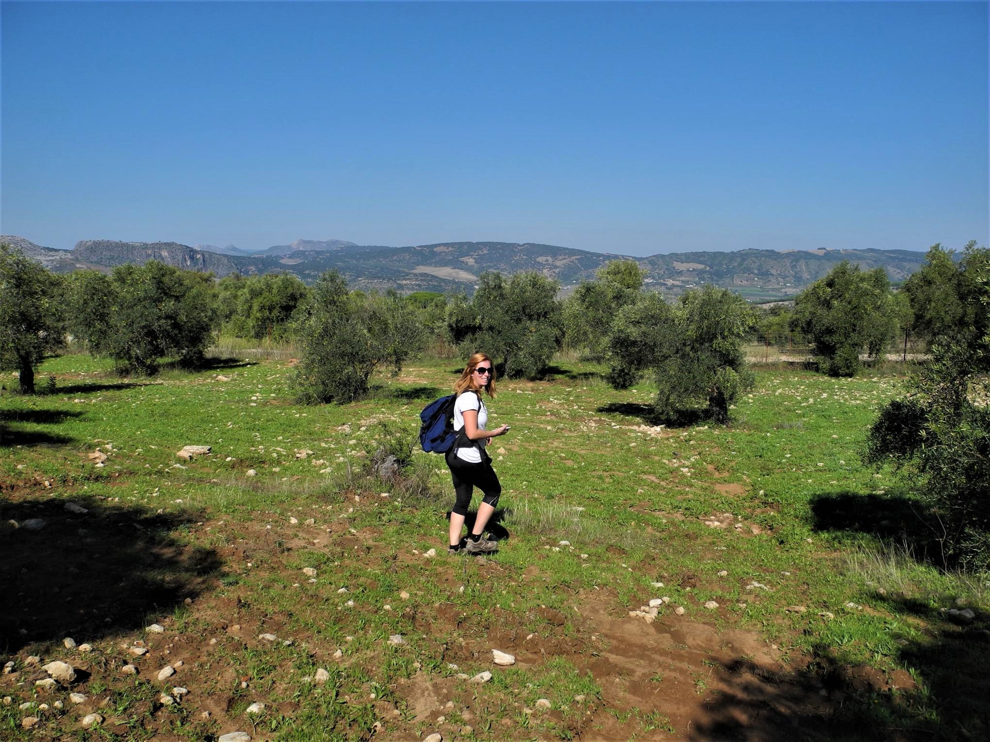 Rázujeme si prašnou cestou mezi olivovými sady a pán v telefonu (aplikace Locus Map) dává našemu směru zelenou. Čím víc se od Rondy vzdalujeme, tím je velkolepější a krásnější. Až když je slavný most Puente Nuevo úplně prťavoučký je konečně vidět ta největší podivnost celého města. Jeho vzdálenější část začíná na rovině a zdálo by se, že Rondu žádné velké geologické zvraty nečekají. Jenže přesně u mostu Puente Nuevo se země propadá o sto metrů níž a pak jakoby nic, znovu pokračuje smířlivou rovinkou. Pán Bůh měl místy při tvorbě krajiny rozmanité nápady.