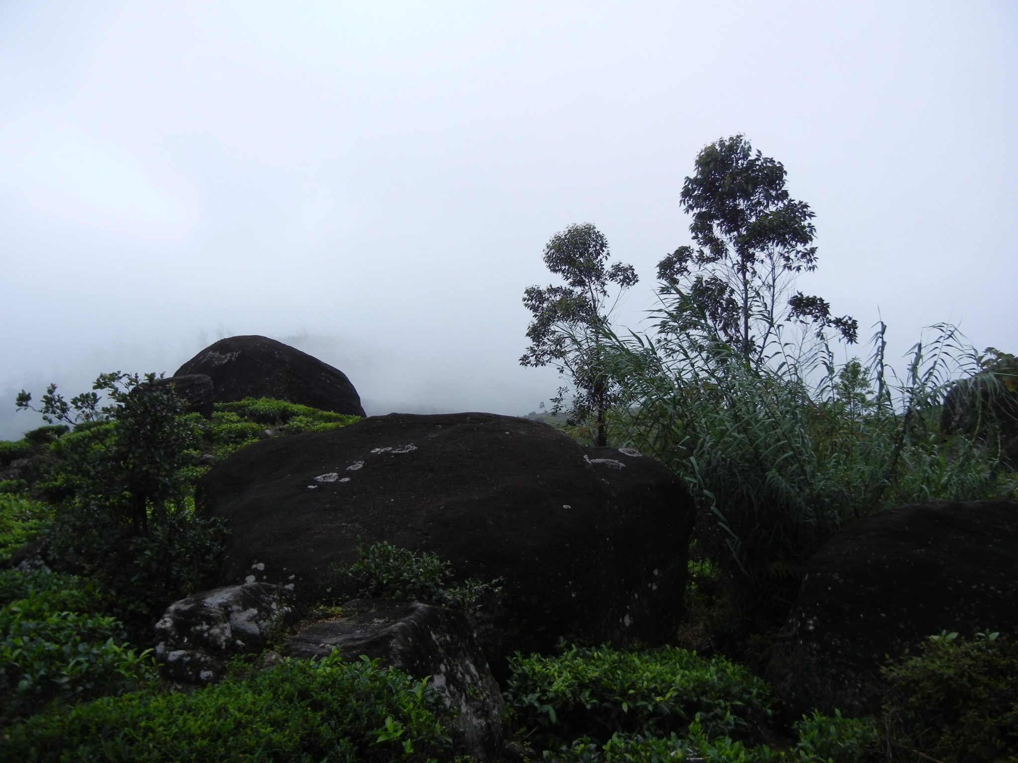 Odněkud z mlhy se náhle vynoří místní chlapík a přidává se k nám. V jedné ruce má mačetu a v druhé Detol (olej proti pijavicím). Náš tým tedy tvoříme já s Léňou a dva průvodci. Nově příchozí nám stříká Detol na boty, nohy i kalhoty, aniž by zjišťoval, jestli o to stojíme. Ani to moc nesmrdí, a i kdyby, jestli mě to má ochránit před pijavicemi, jsem ochotná ho klidně i vypít. Začátek cesty vede úzkou pěšinkou mezi nízkými keři, vysokými listnatými stromy a obřími černými kameny. Vypadají, jako že je tu jen tak náhodou někdo rozházel.