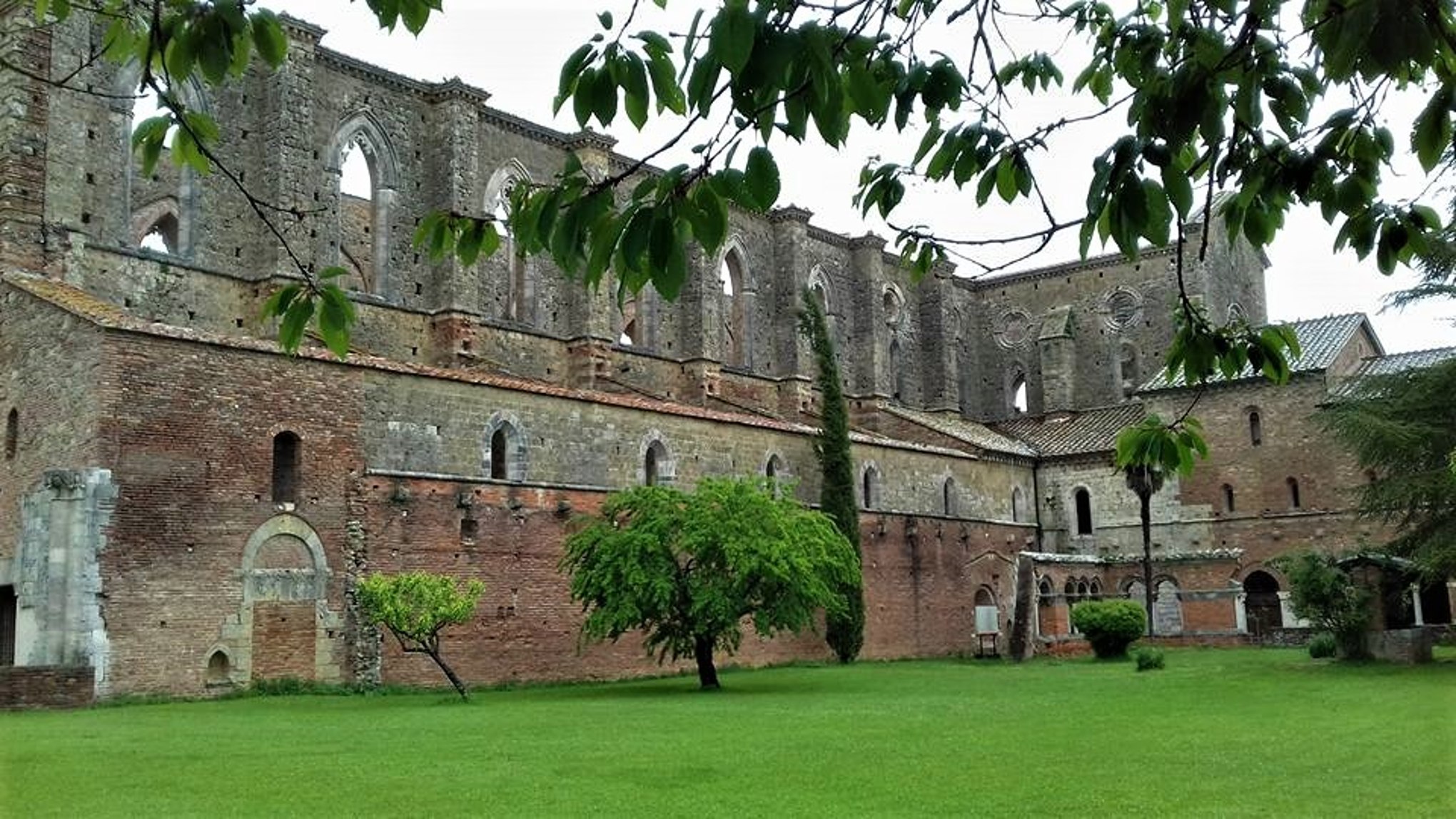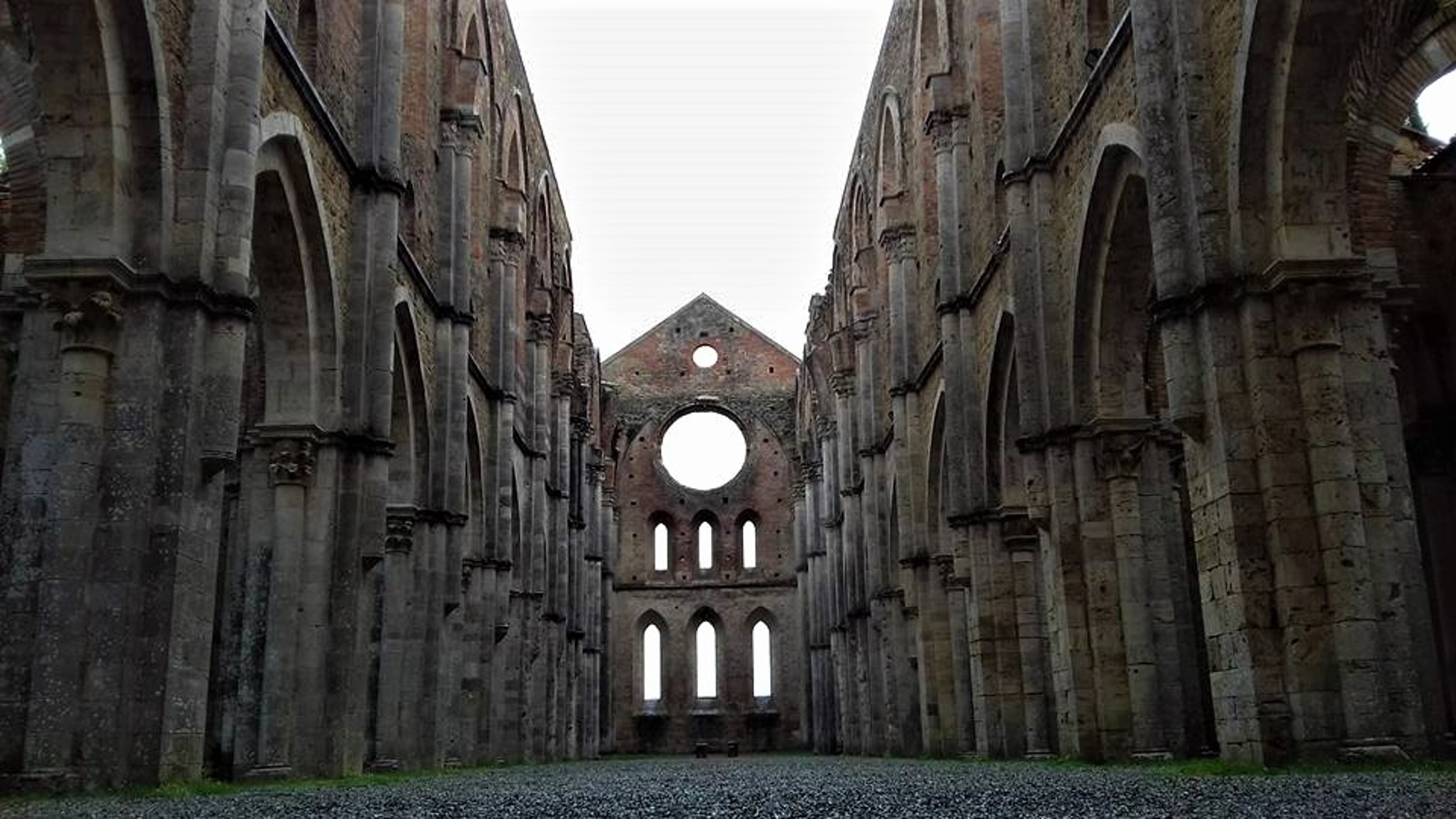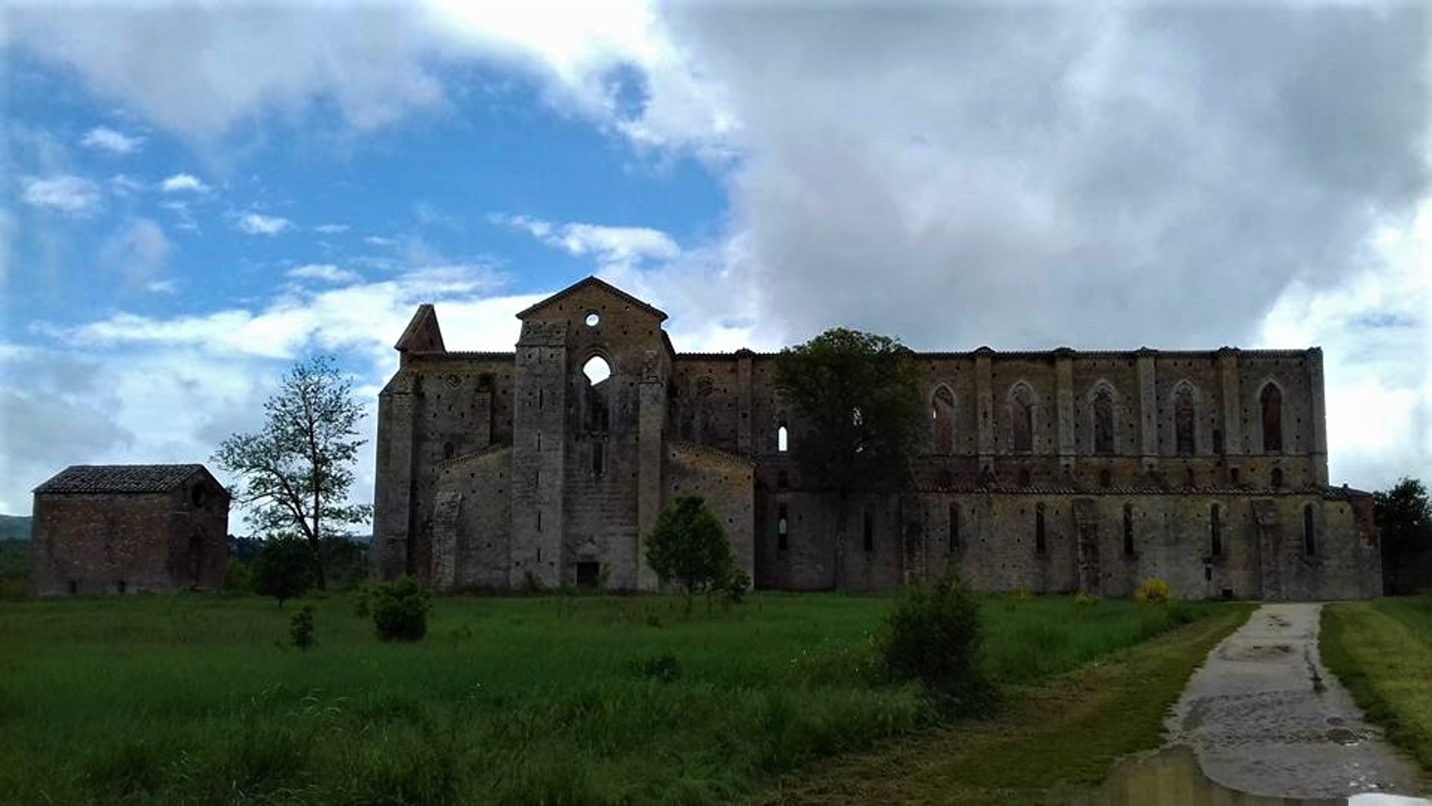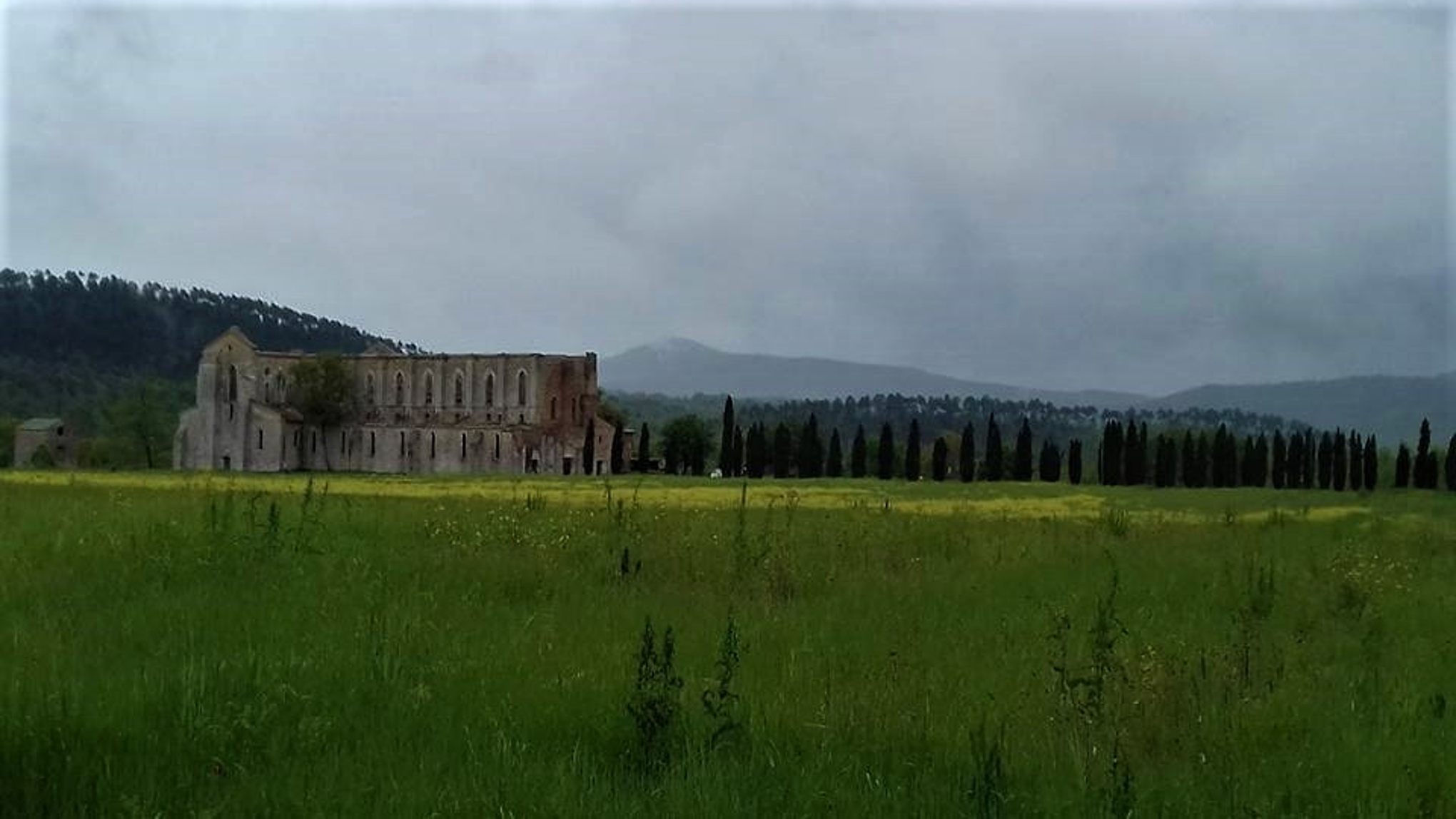 Jestliže má člověk v této oblasti k dispozici auto, byl by hřích nenavštívit zříceninu cisterciáckého opatství San Galgano. Přestože má gotická stavba dost hořkou historii (morová rána, drancování, zásah bleskem) působí na mě ruiny optimisticky a vznešeně. Chybějící střecha je přímou vstupenkou do nebe, ze kterého na nás začíná pršet. Chjo…