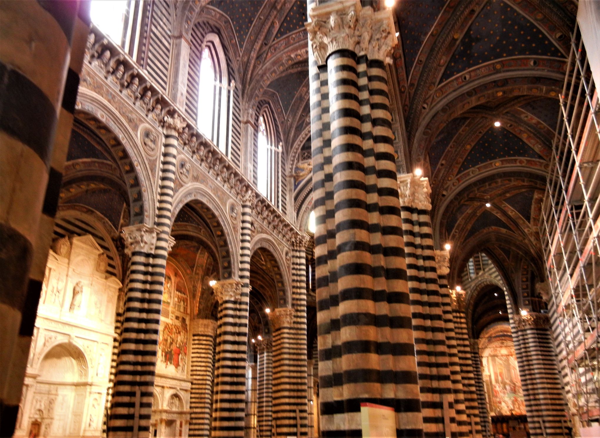 Depresivní dojem nezachránil ani Sienský dóm s podzemním baptistériem na náměstí Piazza del Duomo. Odradila mě cena vstupného, která byla v době naší návštěvy 13 euro (v hlavní sezóně dokonce 15 euro). V ceně je totiž zahrnutý i vstup do bapstistéria a většiny muzeí. Nejsem ale úplně muzejní typ, takže jsem do katedrály nahlédla jenom otevřenými dveřmi za turniketem. Černobíle pruhovaný mramorový interiér je zajímavý a netradiční, ale ani ten mě k platbě 13 euro nepřesvědčil.