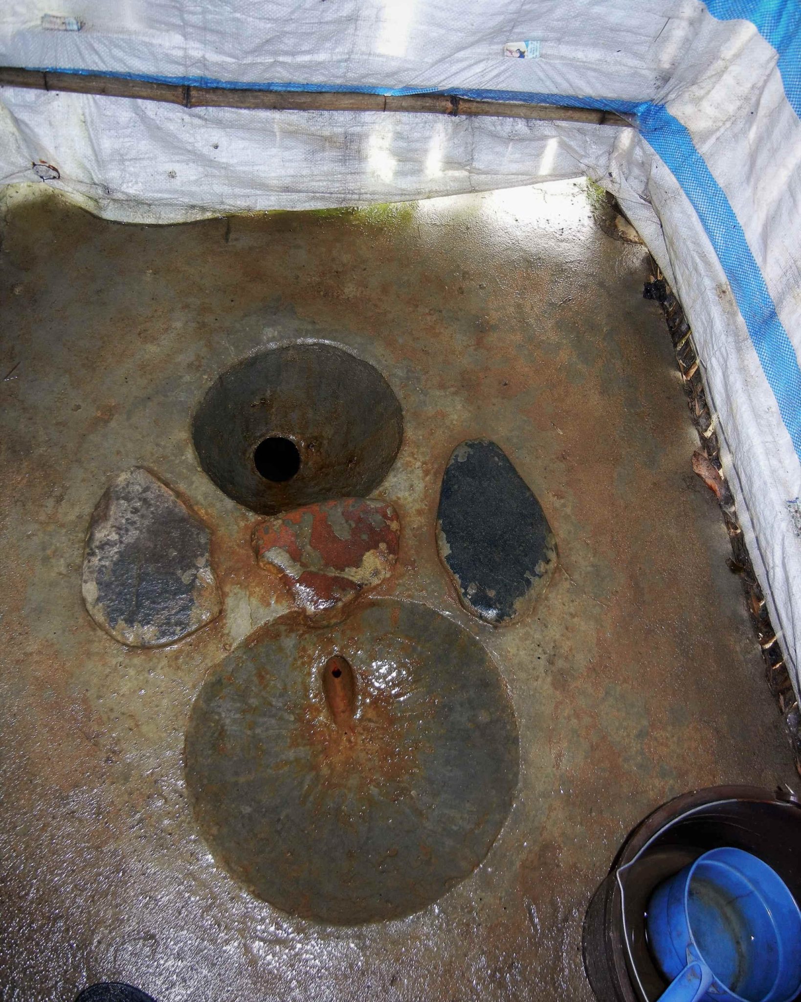 Údolí sevřené z obou stran rýžovými políčky je ale krásné i v dešti. Jakoby rýžoviště byly jemnou krajkou lemující kalnou řeku klikatící se údolím. Déšť chvílemi ustává, ale jakmile si sundáme ponča, hned se zase spustí. Když přicházíme do malé vesničky, kde si dáváme obědovou pauzu, jsem už mistr světa v sundávání a nandávání pláštěnky. Na sobě si jí nechci nechávat, protože se v ní, při místní vlhkosti, neskutečně pařím, a tak jsem vděčná za každou chvilku, kdy ji mít nemusím. K obědu máme celkem chutnou polévku se zeleninou a instantními nudlemi. Po jídle mě velmi pobaví cesta na záchod. Už jsem na cestách zažila nejrůznější modely tureckých záchodků, ale ten zdejší vidím poprvé. Vpředu je menší díra s větší mísou, zřejmě proto, že TO cáká a vzadu (tedy při předpokladu, že si sednete správně) je větší díra s menší mísou, protože TO prostě žuchne dolů. Je to vlastně úžasně praktické, ale když vejdu prvně na záchod, chvíli musím přemýšlet, jak na to.