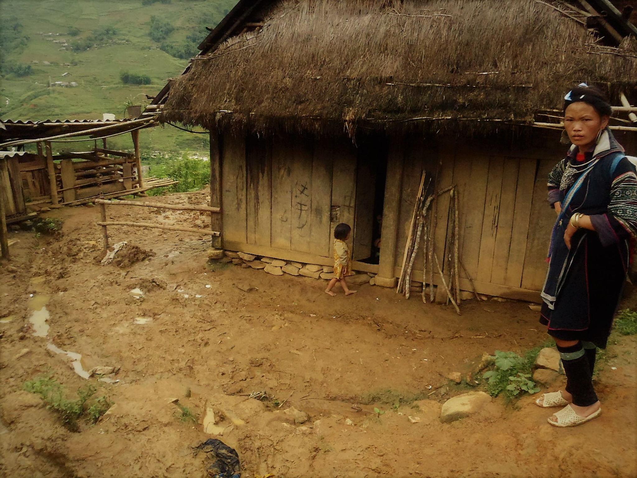 Po obědě není krajina už tak krásná a začínáme potkávat víc dalších turistů. Do vesnice, kde máme nocovat přicházíme už ve 14:30 a průvodce se tváří, jako že bychom měli být strašně unavení, a on nám nabízí jedinečnou šanci blaženého odpočinku. Jenže mi nejsem unavení vůbec. Mnohem víc jsme zvědaví, a tak vyrážíme na obhlídku okolí. Blátivou cestičkou vylézáme nad vesnici a celou ji obcházíme. Cestou si všímáme zdejšího prostého života, který je jako vytržený ze středověku. Před polorozpadlými prkennými domky si hrají v blátě děti a dobytek polehává hned vedle nich. Jen všudypřítomné satelity nám dávají vědět, že jsme skutečně v 21. století. Je zvláštní je vidět na zdejších chatrčích.