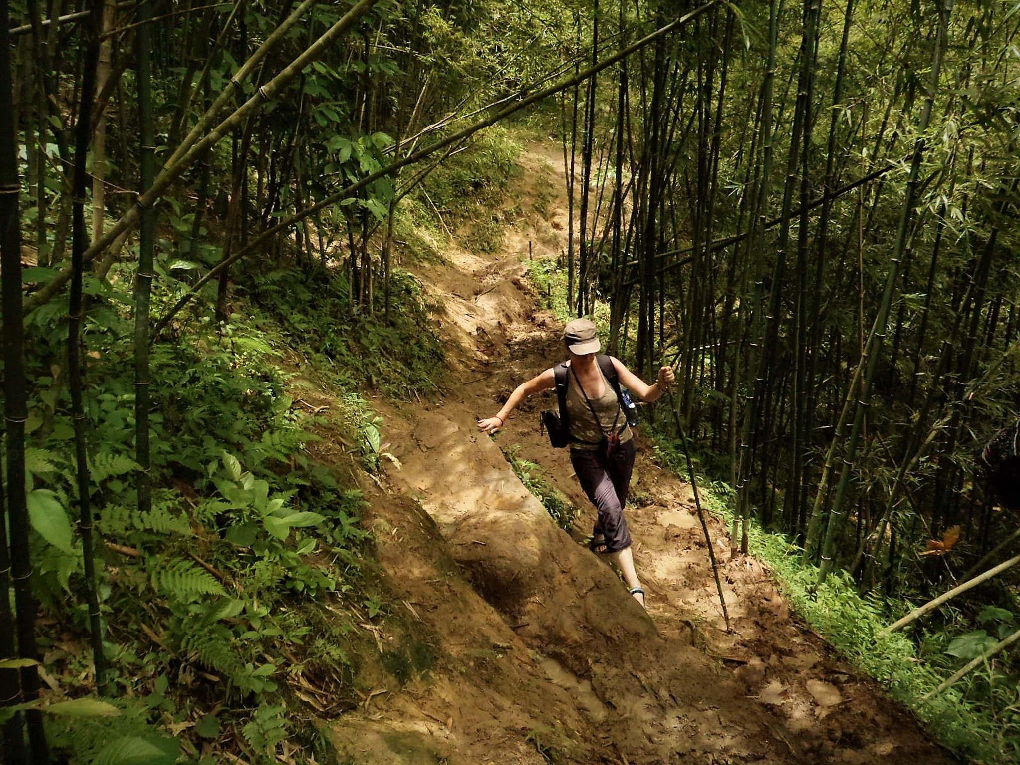 V noci poslouchám jak na střechu, kterou máme jen pár čísel nad hlavami, padají provazy vody. Ráno nás ale probouzí sluníčko a bláto! Průvodce nám vysvětluje, že starší z Angličanek dnešní pochod určitě nezvládne, a tak musí podstatně změnit a zkrátit trasu. Nám i beze změn přijde, že je celý trek tak trochu ošizený a nechceme se nechat připravit o slíbený bambusový les a vodopády. Průvodce nám proto kreslí na kus papíru improvizovanou mapu a vyrážíme na vlastní pěst. Sejdeme se až u auta. S pocitem nenadálého dobrodružství se vrháme do bláta. Hned kousek za vsí utrhne Martin řemínek od boty, když se snaží vytáhnout nohu zapadlou po koleno do bahna. Lepící pásku máme naštěstí vždycky po ruce, a tak si umně přitejpuje zbytek boty k noze a jde se dál. Zásadní událost dnešního dne (alespoň z mého pohledu) se přihodí až v bambusovém lese. Moc se nám líbí místní příroda a všudypřítomní motýli, a tak jdeme hlouběji a hlouběji… A najednou nevíme kudy kam.