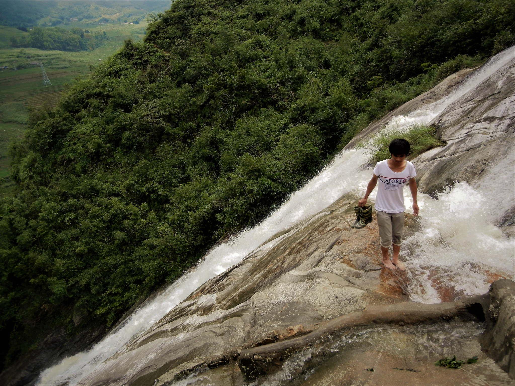 Vodopád je široký asi třicet metrů a voda v něm, s obrovským rachotem, padá do víc než padesátimetrové hloubky. Nemůže se mi tedy nikdo divit, že se bojím přeskákat jednotlivé proudy vody a dostat se doprostřed skály, kam Martin po vzoru Vietnamského mladíka hrozně nutně potřebuje. Ke skoku mě horlivě vybízí, marně. Když se bojím, tak se prostě bojím! Dneska už žádný dobrodružství. A tečka!