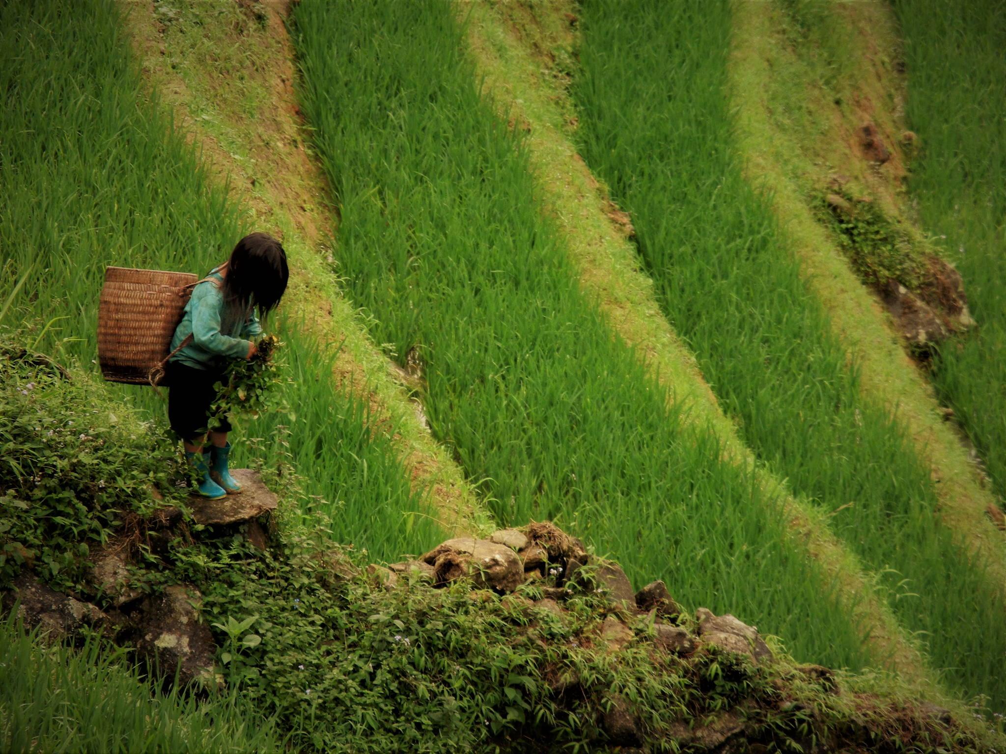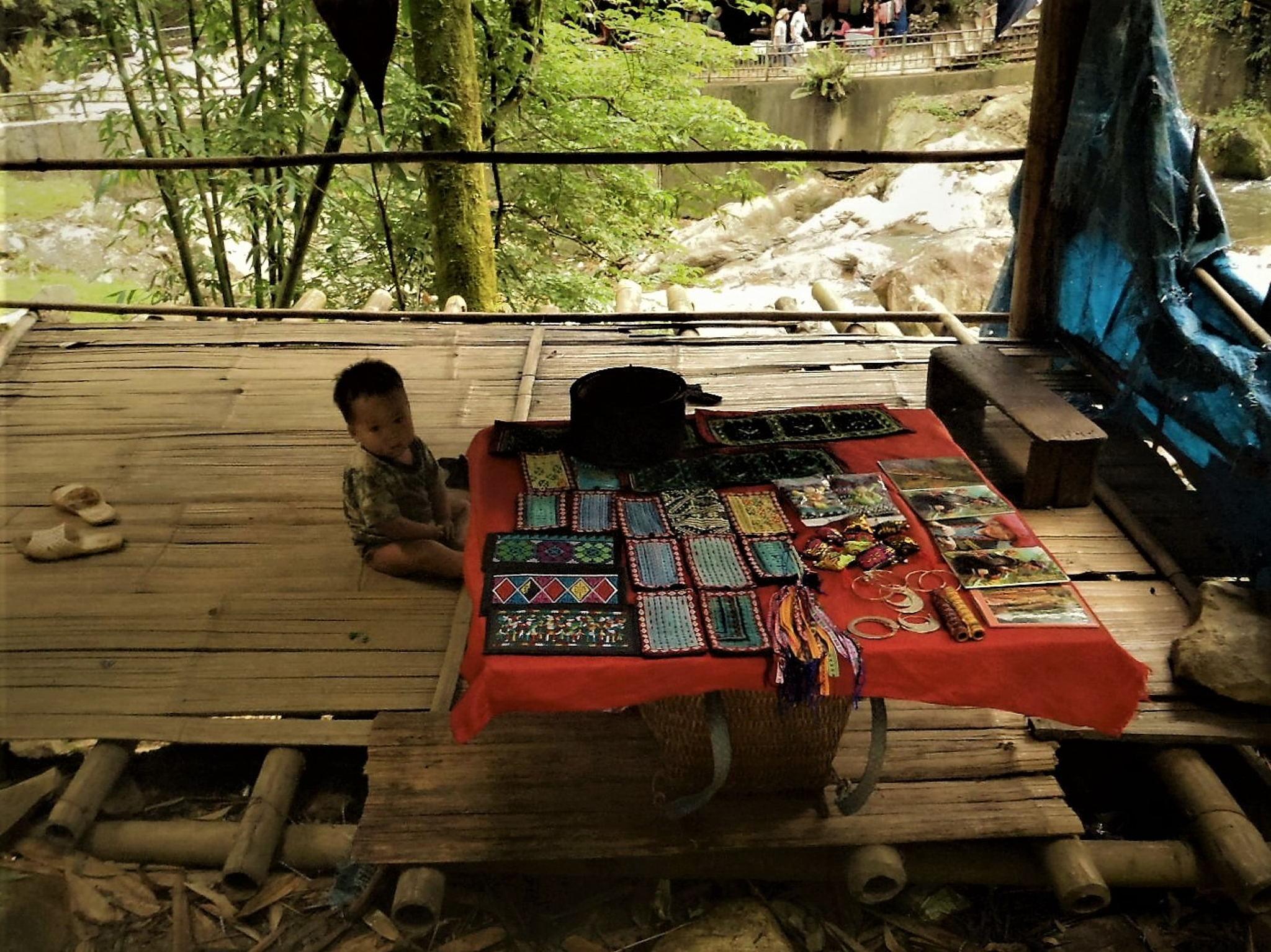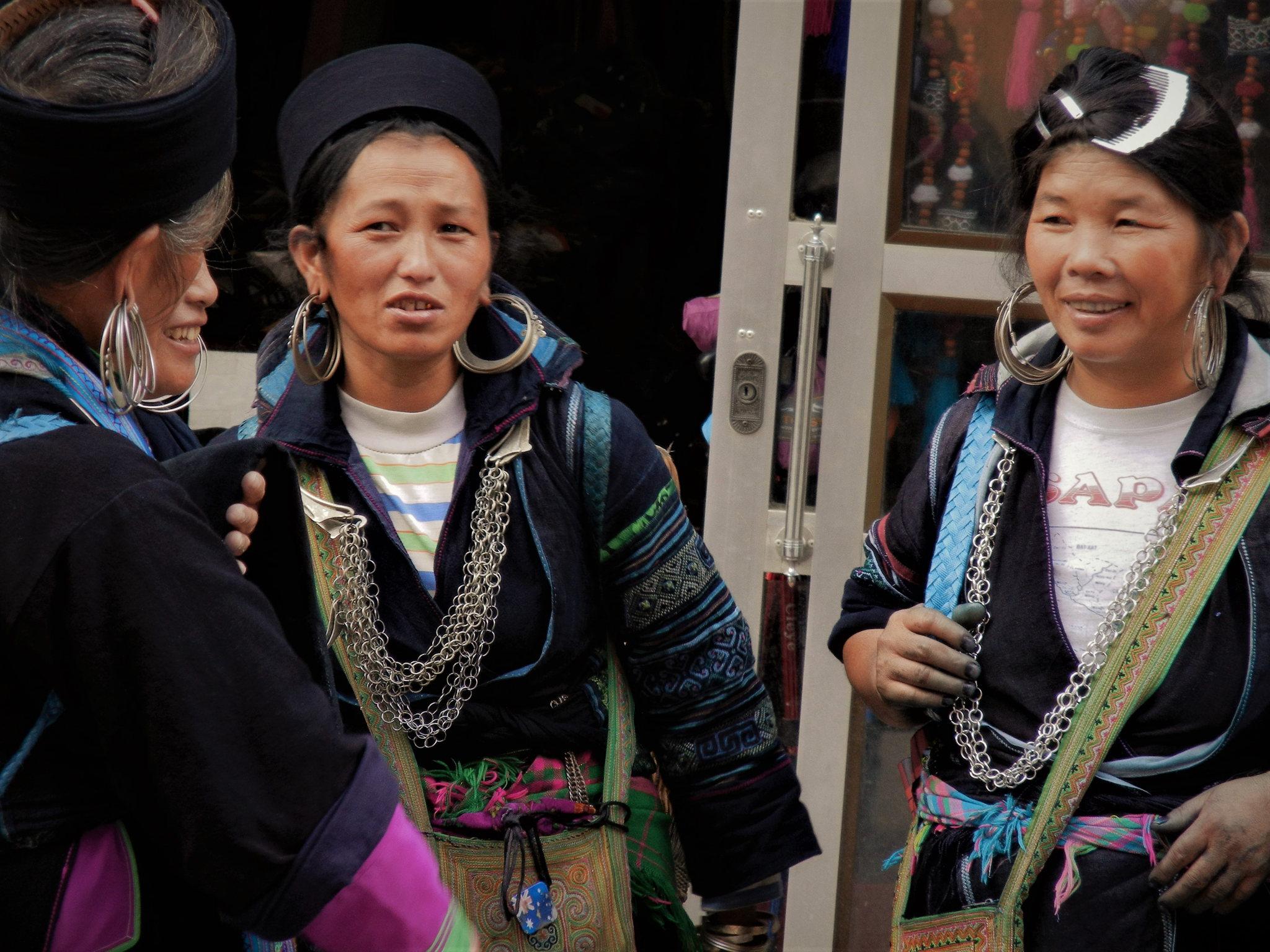 Snad příhoda s batoletem zapříčinila, že během celého pobytu v Sapě nedokážu odtrhnout oči od místních menšin. Nejpočetnějším etnikem jsou tu Černí Hmongové nosící tmavé oblečení zdobené barevnými výšivkami. Látku vyrábějí mimo jiné z konopí a k barvení používají indigo, které dodává oděvu tmavě modrou nebo úplně černou barvu. Neviděla jsem snad jedinou Hmongskou ženu, která by na zádech neměla velkou nůši a v uších obrovské stříbrné náušnice. Ze svých domovských horských vesnic tahají v nůších suvenýry určené pro turisty. Nejvíc na odbyt jdou barevné dečky, tašky nebo haleny. V jejich tradičním rodinném uspořádání mě ani tak nepřekvapuje, že je patriarchální, ale že je zde povolená polygamie. Hloučky žen postávají po celé Sapě jsou tedy dost možná příbuzné, které společně pomlouvají svého muže.
